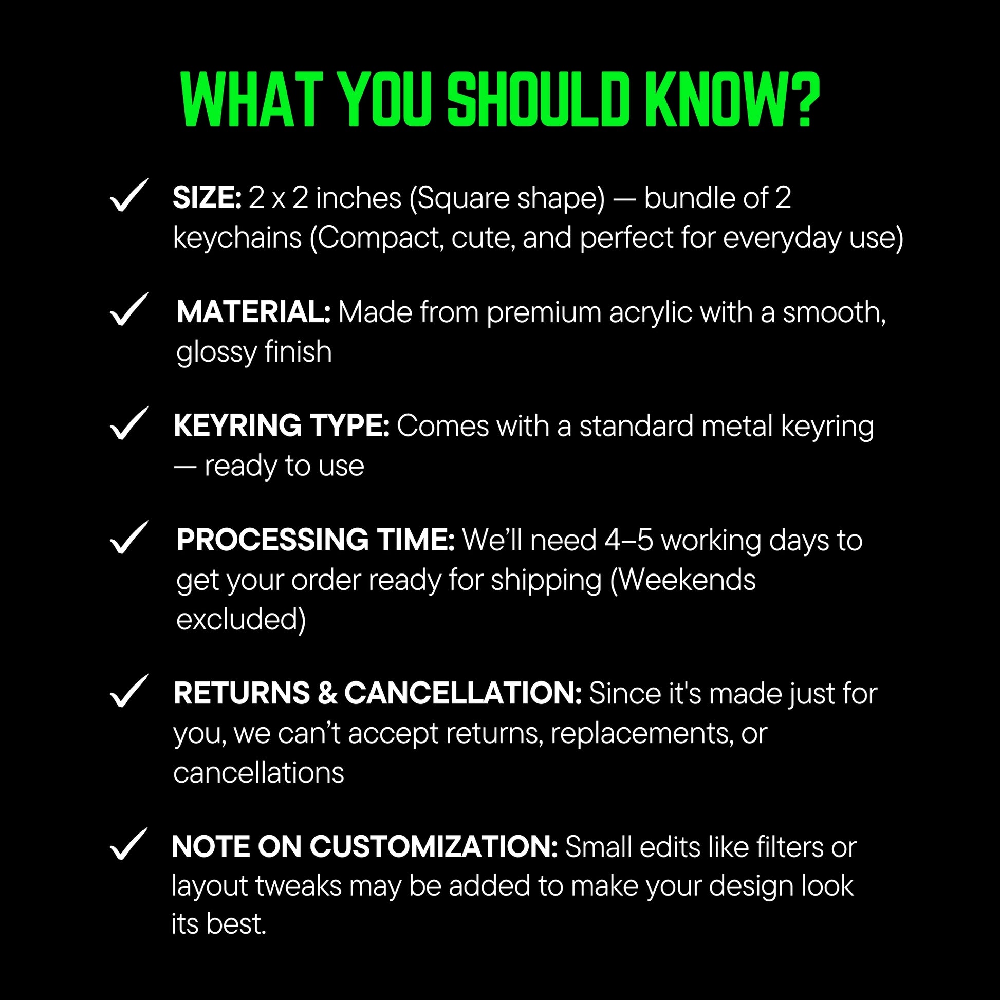 These keychains feature a smooth, glossy surface that makes your design pop. The sturdy acrylic build ensures durability without adding bulk, while the sleek keyring holds your keys, bags, or accessories in style. Compact yet full of charm, it’s the small thing that makes a big impression.