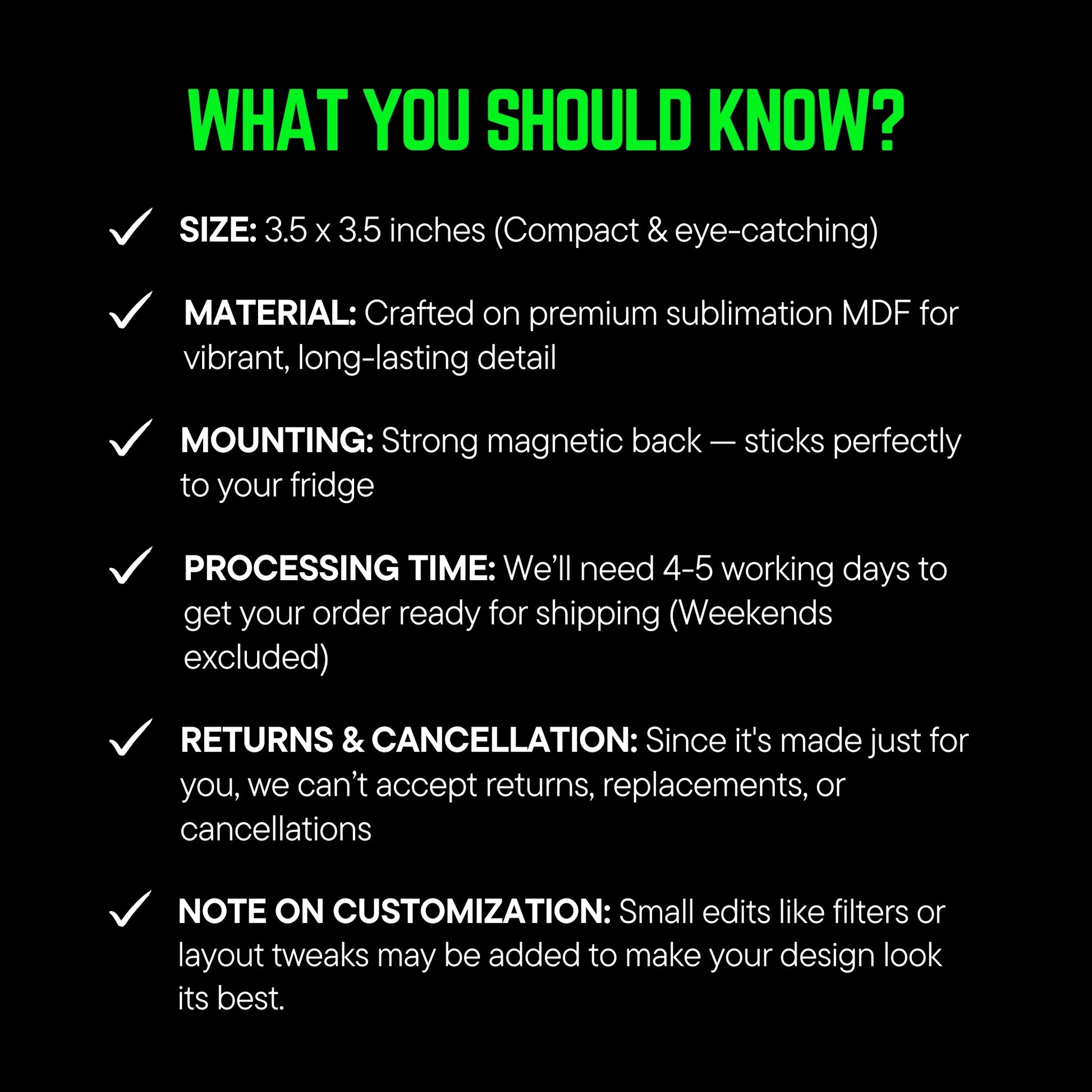 Our Custom Fridge Magnet collection turns everyday memories into eye-catching keepsakes. Printed on high-quality MDF with a magnetic backing, these compact pieces are perfect for adding a splash of personality to your fridge or any magnetic surface. From goofy selfies to heartfelt quotes, they make thoughtful gifts or fun additions to your own space.